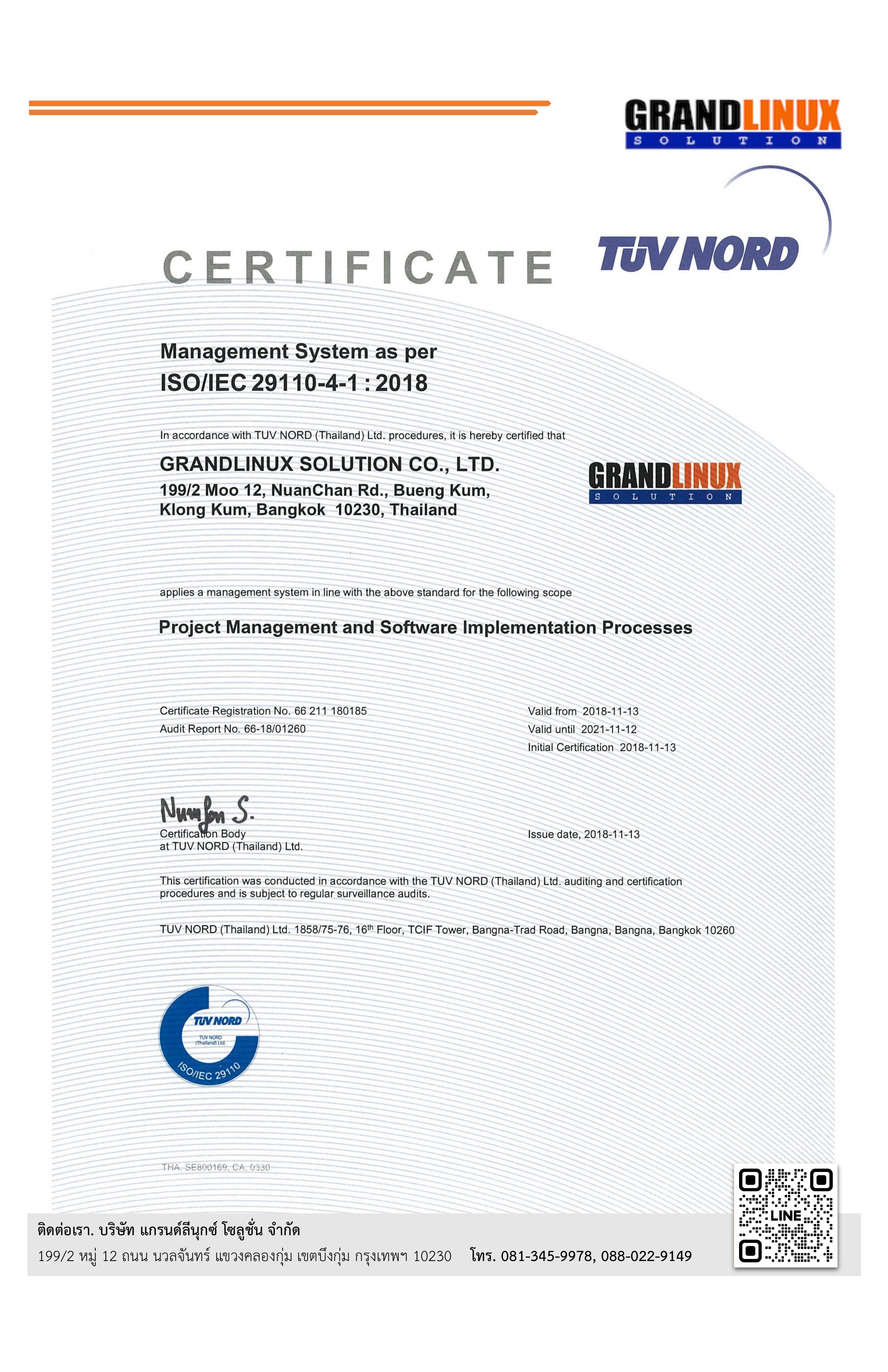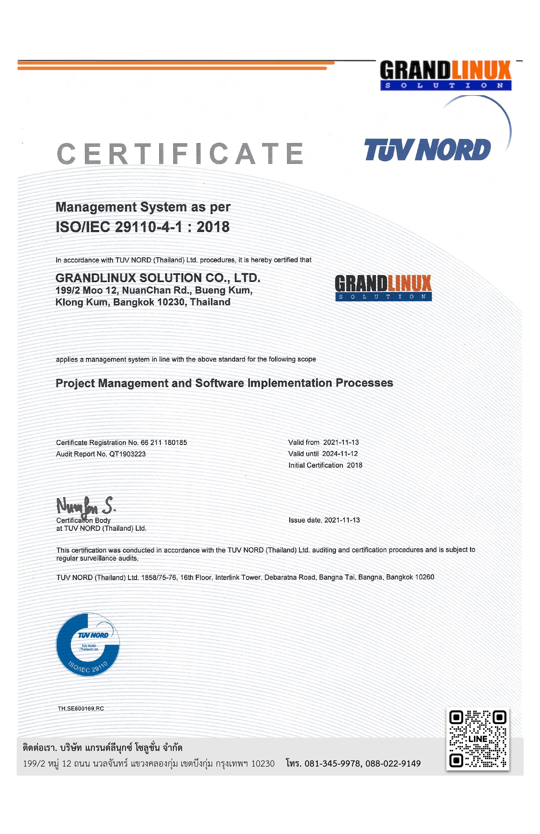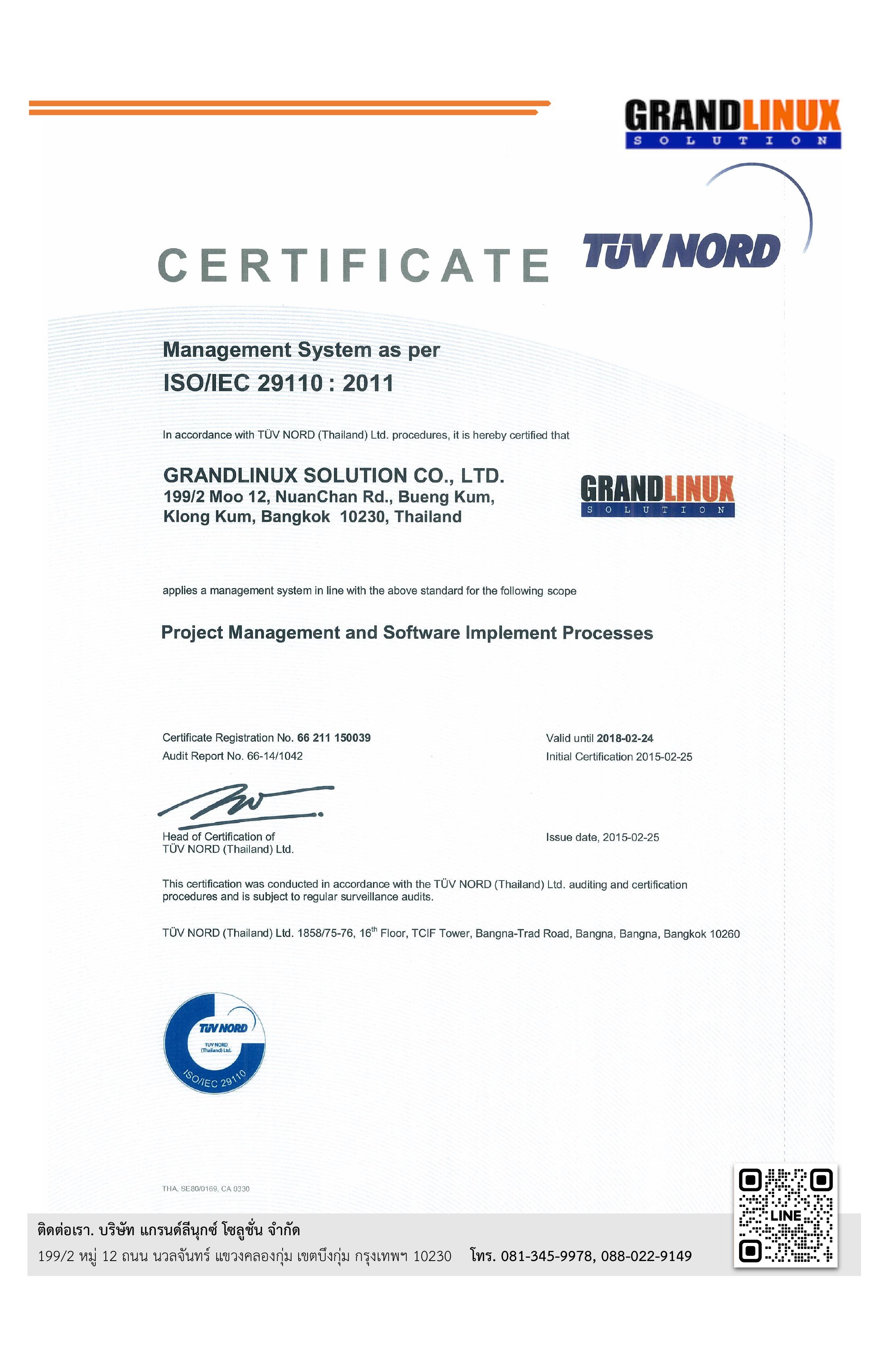 ได้รับการรับรอง ISO/IEC 29110 จาก TÜV NORD ต่อเนื่อง 4 ฉบับ ตั้งแต่ พ.ศ. 2558 ถึง 2570 (กว่า 12 ปี) ครอบคลุม Project Management และ Software Implementation Processes